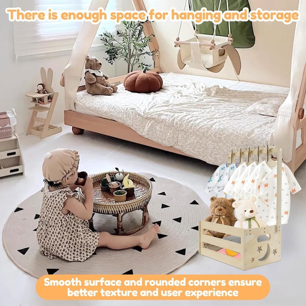 - Habitación del bebé: colocar sobre una cómoda, una estantería baja o en la pared si el diseño lo permite; las perchas pueden colgar desde una barra pequeña o una estructura de bastidor, haciendo visible la ropa bonita del bebé.