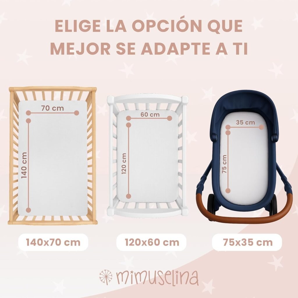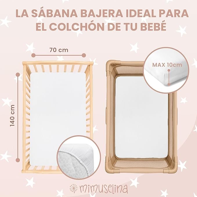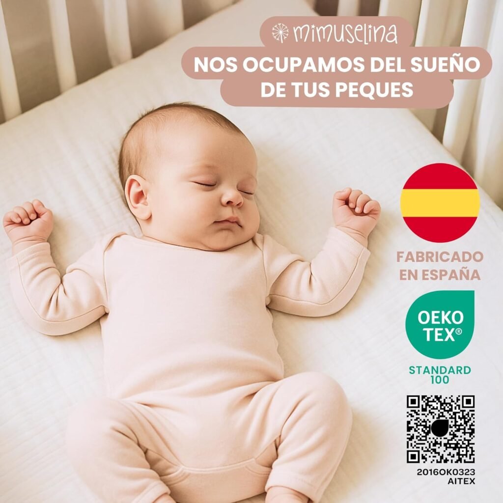 Mimuselina Pack de 2 sábanas bajeras para cuna 70×140 cm en muselina 100 % algodón: ultra suaves, transpirables y hechas en España. Ideales para mantener al bebé cómodo y fresco naturalmente.