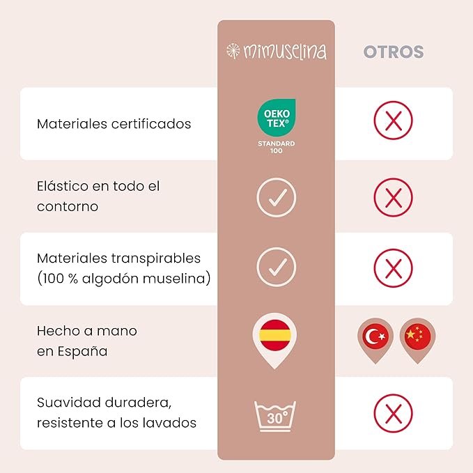 | Confort inmediato | La muselina es tan suave que imita el abrazo del hogar desde el primer uso. |
