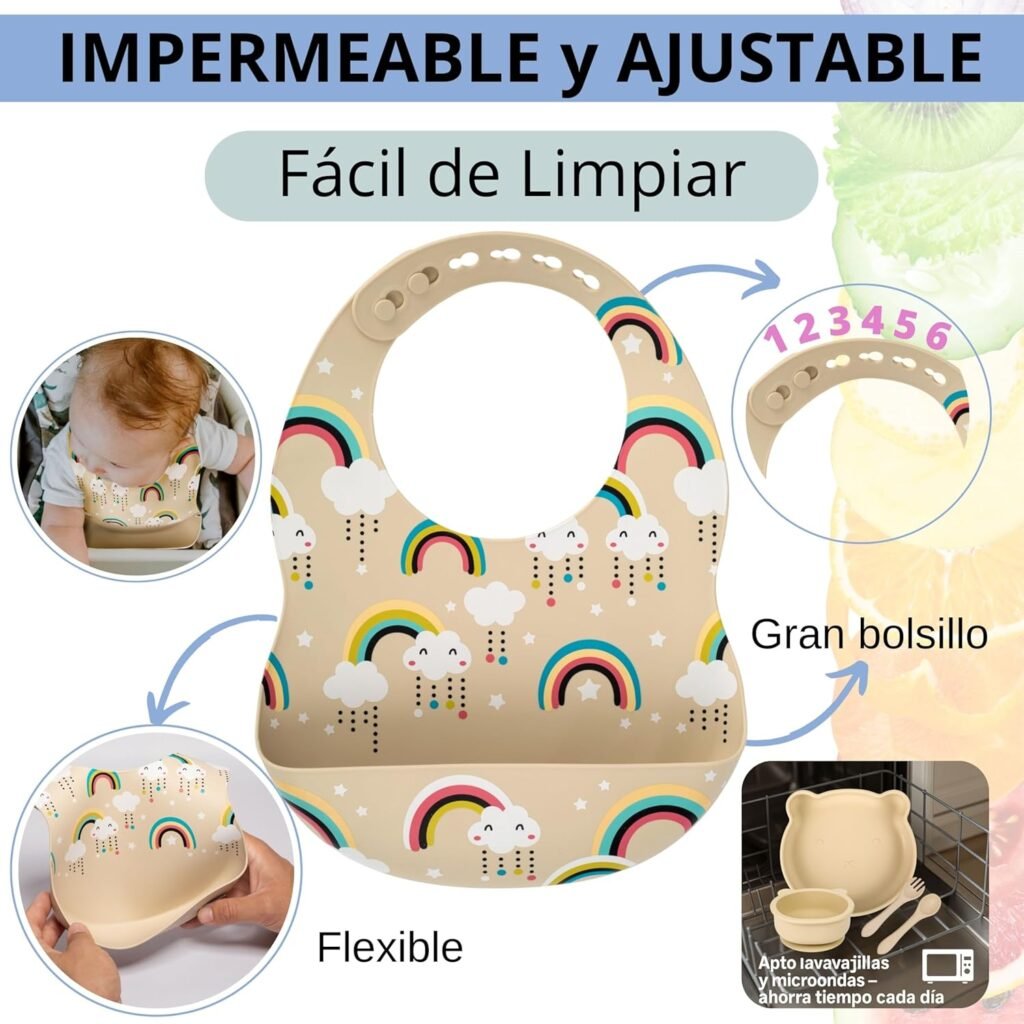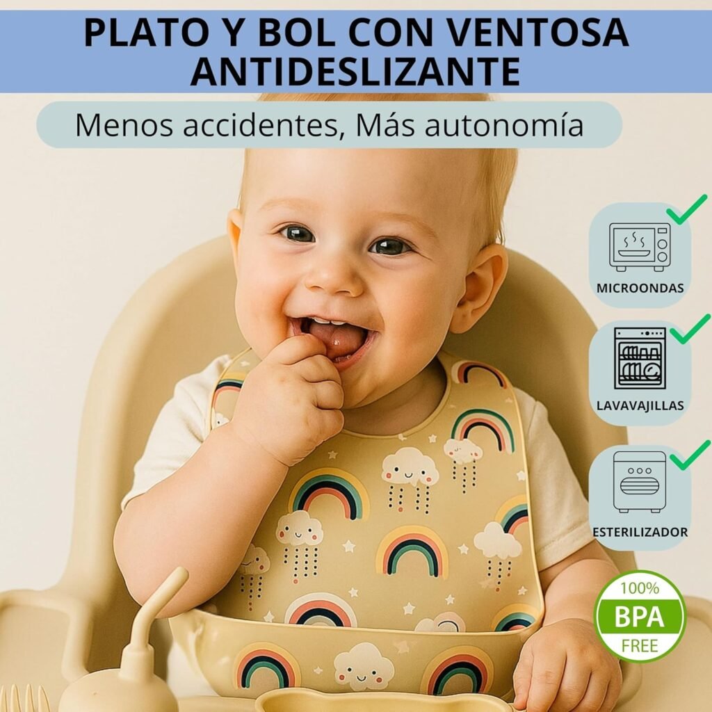 ✔️ Completo y funcional: El set incluye —además de plato y bol con ventosa— cubiertos, vaso y babero, lo que lo convierte en una solución integral para comer o practicar BLW.