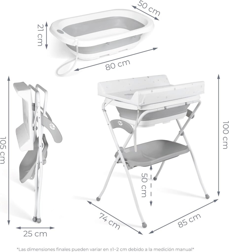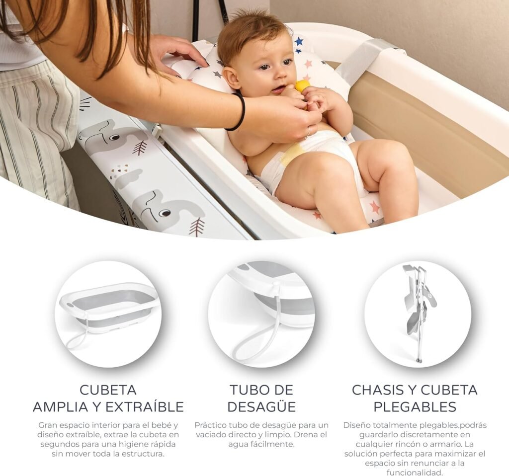✔️ Todo en uno: bañera, cambiador y espacios organizadores, pensados para simplificar la rutina del bebé.